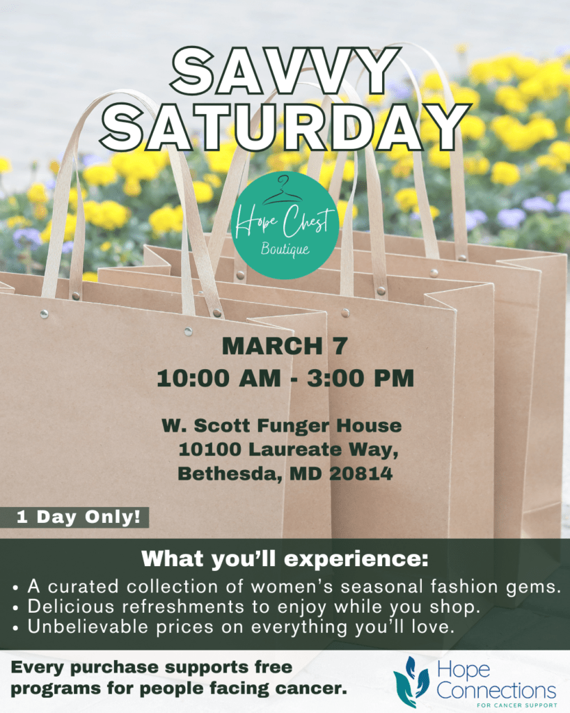 Our Boutique features new and gently used women’s clothing and accessories with 100% of our sales going to support the free and professionally led programs offered at Hope Connections. These special programs have been designed to help people with cancer and their loved ones deal with the emotional and physical impact of cancer.