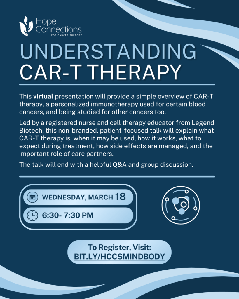 Our free, professionally led programs for people with cancer and their loved ones deal with the emotional and physical impact of cancer. Come to Hope Connections in Bethesda, Landover, or online for emotional support, education, wellness, and hope.